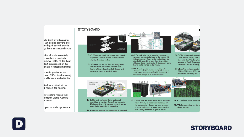 The film needed to combine live action, graphics, and photoreal CGI to clearly communicate how cooling liquid is distributed around servers. With no in-house 3D team and extremely heavy CAD models to work from, JMP needed an experienced 3D specialist who could take ownership of the technical pipeline while also supporting creatively.